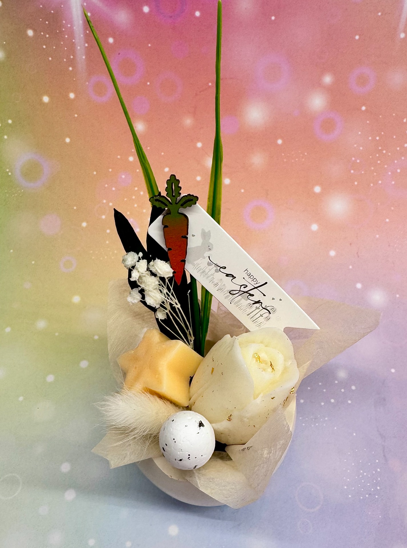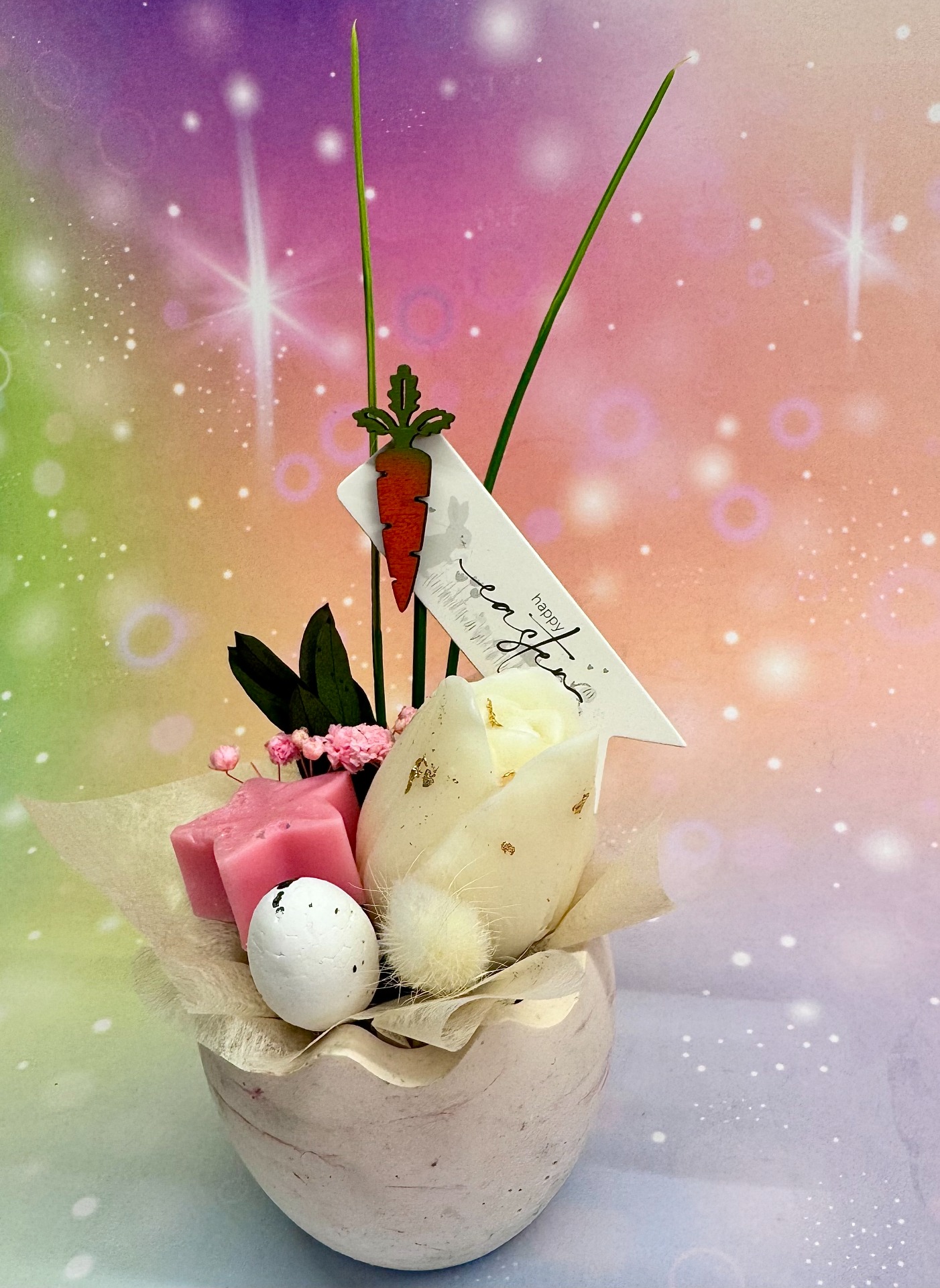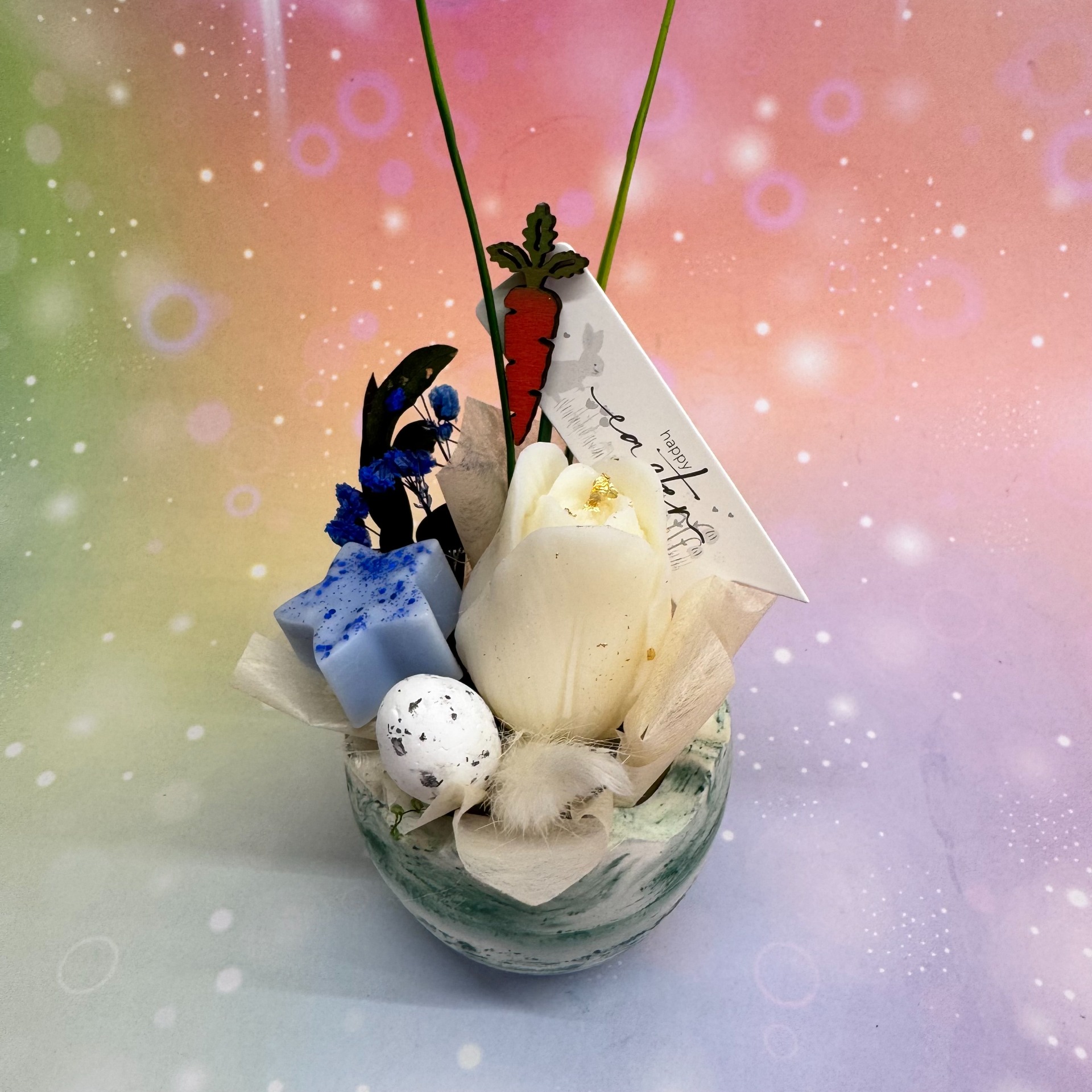 Illatos tulipán gyertya, és kerámiaporból készült tojásban, szárított virággal díszítve. Vegyes színekben.